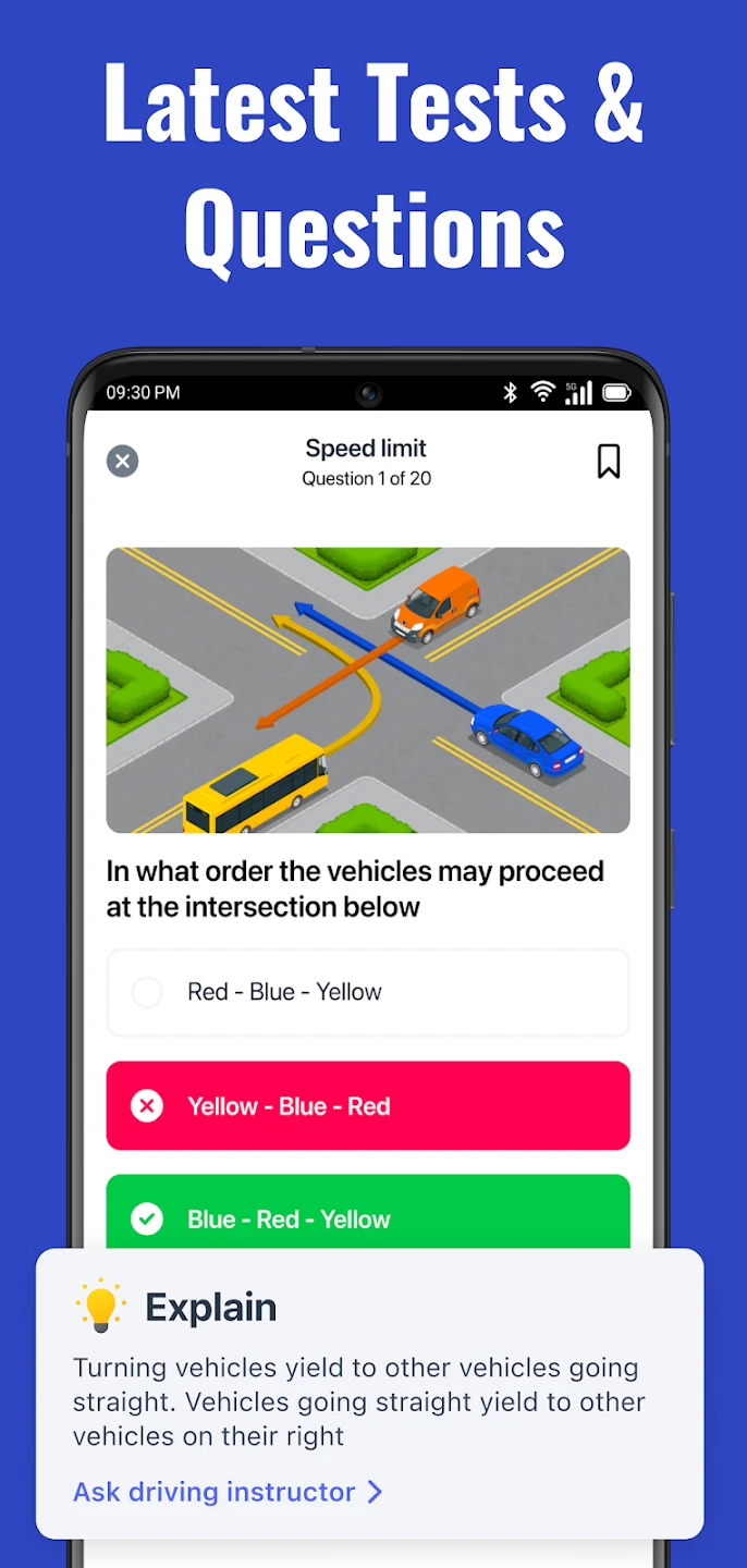 • Instant Feedback & Explanations: Receive immediate results on test attempts, with detailed explanations for both correct and incorrect answers. This functionality transforms each practice session into a learning opportunity, enabling rapid comprehension of complex rules such as proper lane usage during turns, and reinforcing safe driving principles for better retention.