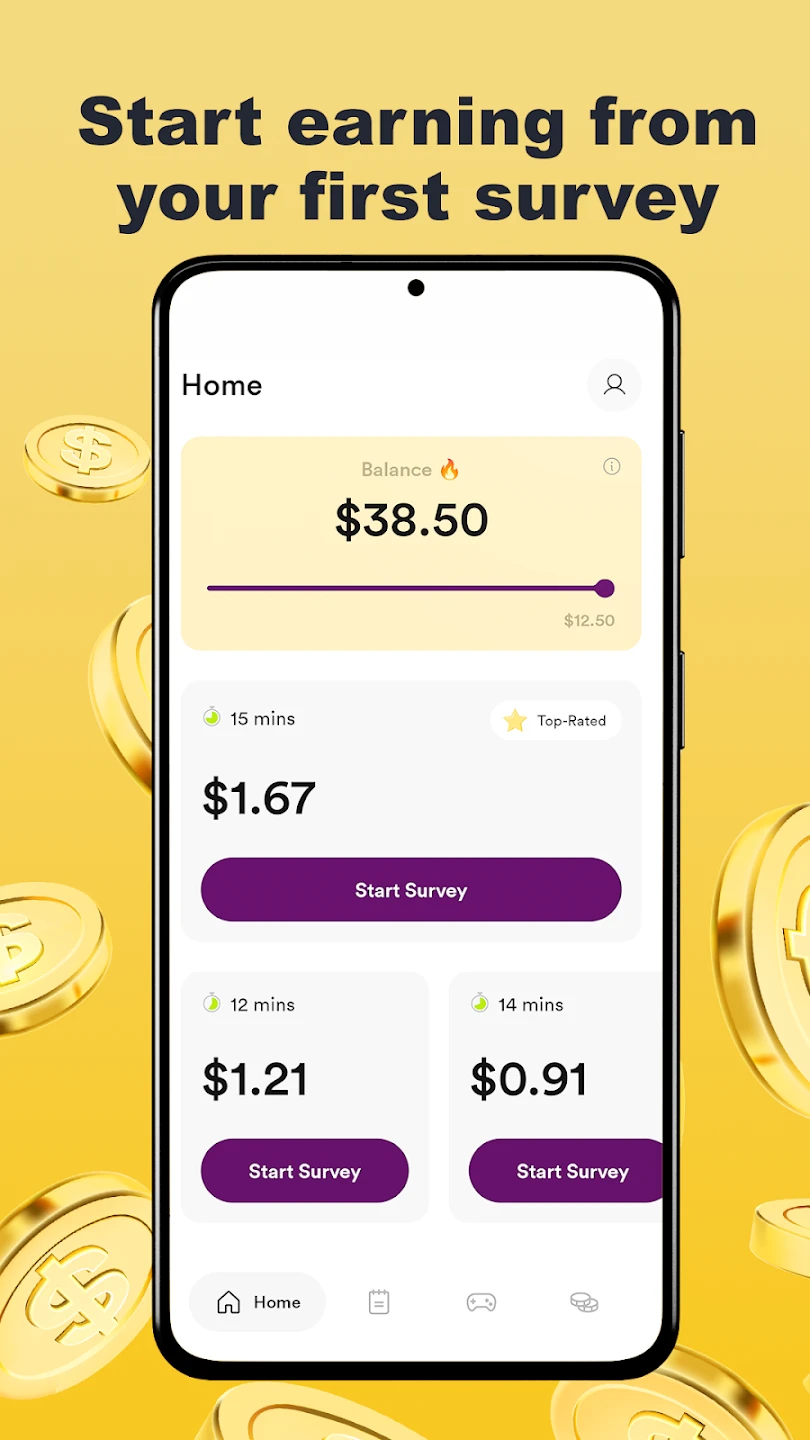 • Earning Rewards and Payment Processing: Users accumulate points, which can be exchanged for cash or gift cards, and the app handles the payout process once the user meets specified threshold criteria. This system is valuable because it offers tangible benefits for completing tasks, provides clear transparency on earning rates, and highlights the direct connection between effort (completing Golden Surveys – Make Money tasks) and financial gain.