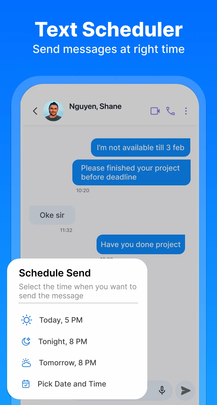 • Message Scheduling (Send Later): Easily compose a text message and set it to be delivered at a specific future date and time. This feature is incredibly useful for individuals who want to send messages but are physically unavailable, like when traveling or in meetings, ensuring communication doesn’t pause.