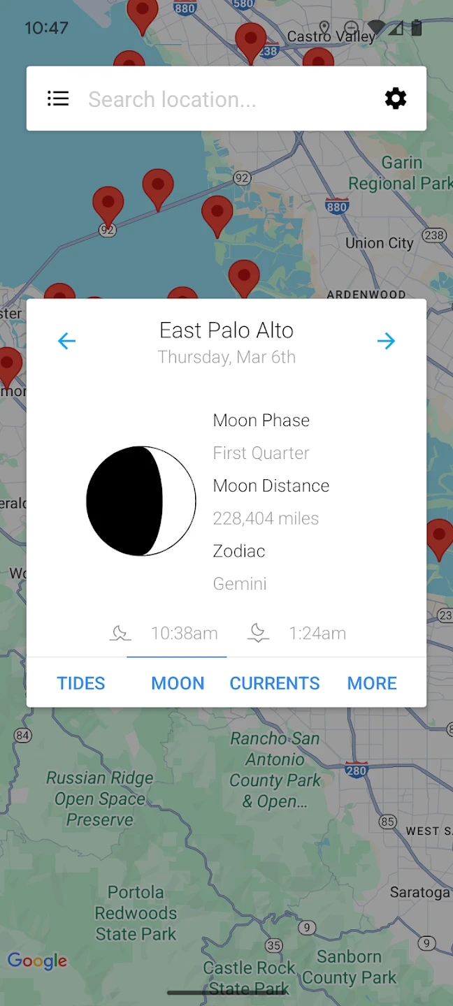 - Detailed Moon Phase Information: Beyond basic tide predictions, the app includes detailed moon phase data, explaining the current moon type (e.g., New Moon, Full Moon, First Quarter, Last Quarter) and its impact on tidal range, aiding users in understanding natural cycles and planning activities accordingly.Gain deeper insight into how lunar cycles influence tide predictions.