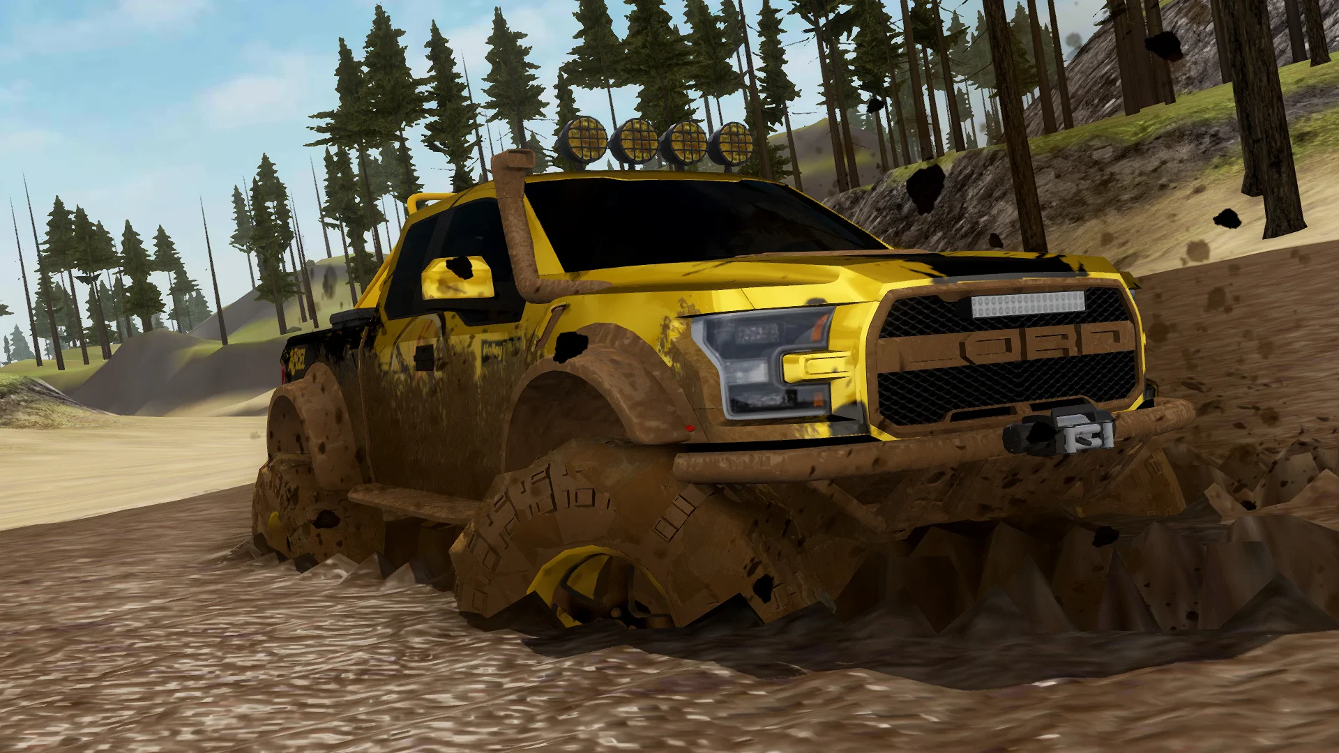 - [Core Gameplay Loop]: Drive various off-road vehicles through challenging courses, collecting coins, completing objectives, and battling other drivers. Players interact with the environment physics, perform stunts like jumps and flips, and use weapons such as spike strips or nitro boosts to sabotage opponents, creating a chaotic racing experience.