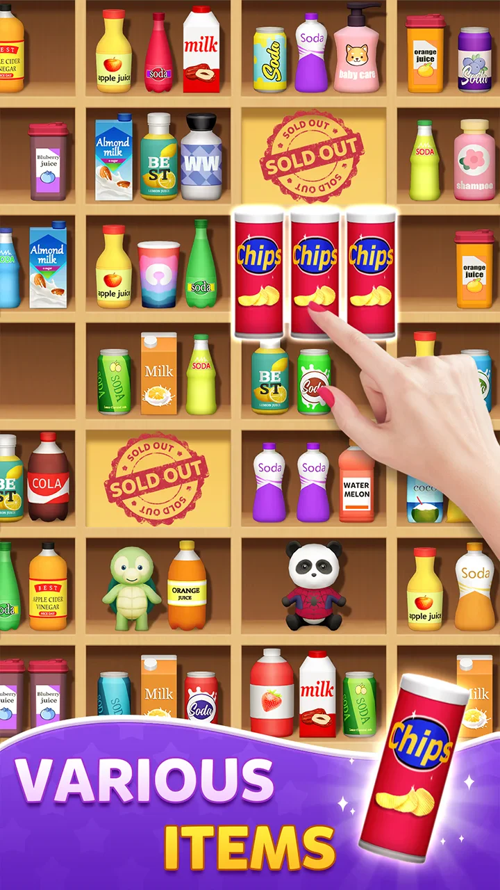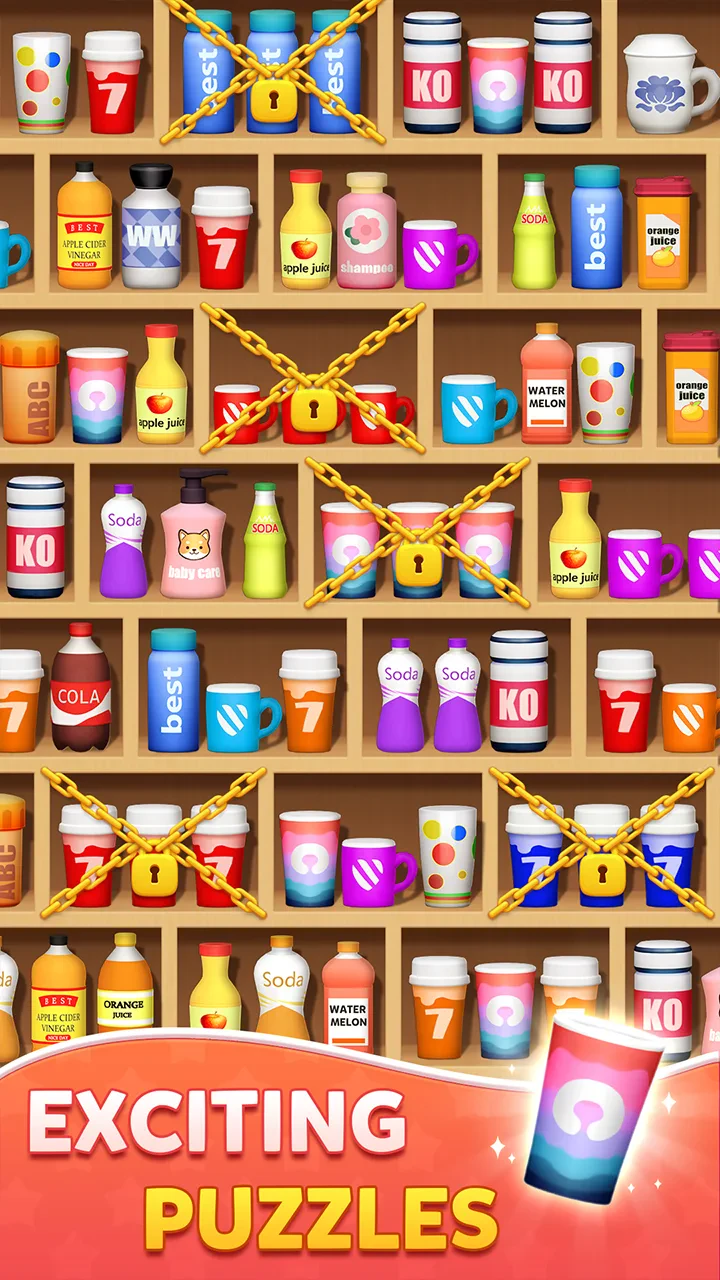 - [Visuals or Art Style]: Sort Match:3D Goods Master features bright, colourful graphics and high-quality 3D models of goods (fruit, toys, tools, etc.). The design uses a stylized look combined with smooth animations and particle effects, creating a vibrant and immersive visual experience.
