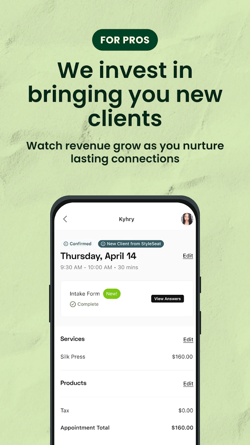 • Client Relationship Management: Organize client profiles with notes on hair type, color preferences, and spending history, making it easier to personalize services and build lasting customer loyalty with a single tap.