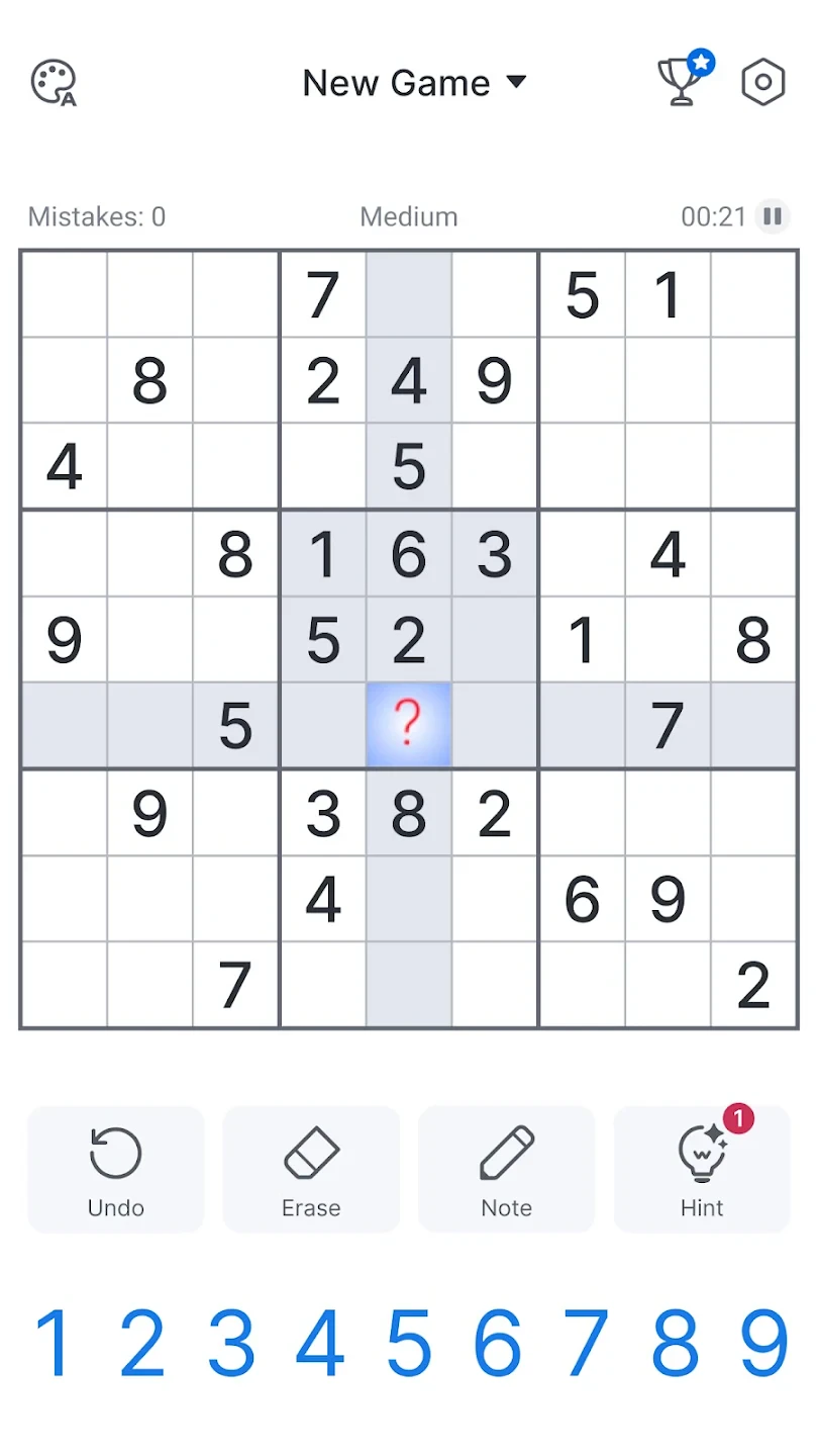 - Step 2: Click empty cells and enter numbers, using the number selection pad. The app highlights the entire column and 3×3 square to show where the number already appears.