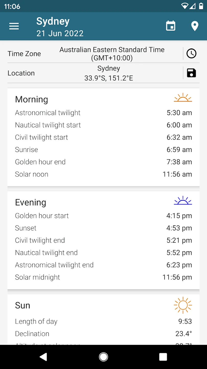 - Precise Solar Calculations: The app utilizes advanced algorithms to accurately determine sunrise, sunset, solar zenith, and azimuth angles. This benefit is particularly useful for photographers setting up timelapse sequences that require knowing exact lighting conditions.