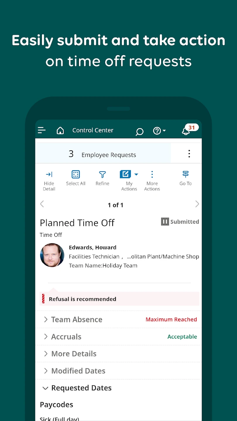 - Seamless Mobile Access: Available via a mobile web application and dedicated app, UKG Dimensions lets managers approve time-off requests, view schedules, and manage basic tasks on the go. This mobility supports faster decision-making, enhances workforce agility, and integrates workforce management into the busy flow of daily operations.