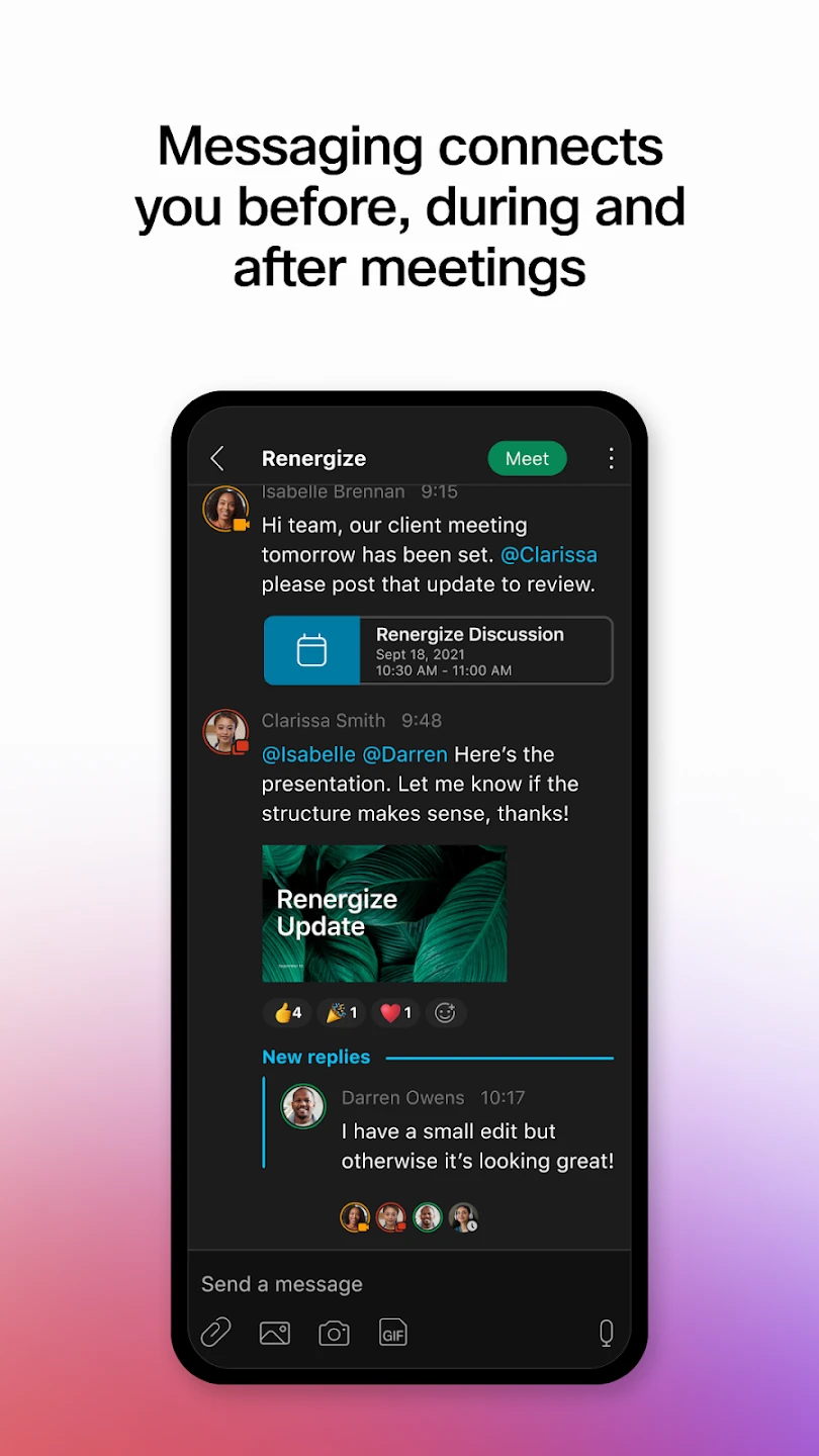 - Team Rooms: Organize virtual spaces for persistent conversations around specific projects, with dedicated spaces for different teams or workstreams. This setup fosters better context retention and reduces information overload by keeping work-related discussions organized.