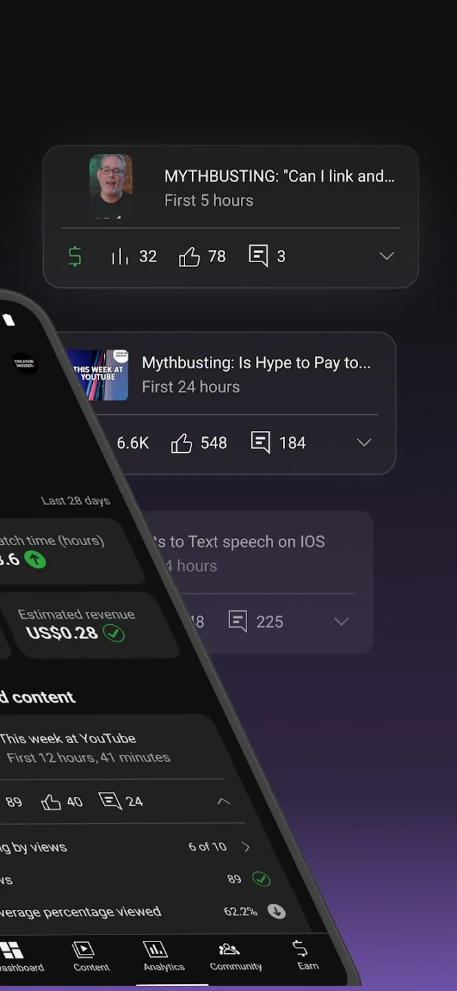 • Performance Dashboard: Gain a clear understanding of video performance metrics like views, engagement, and watch time directly through intuitive charts and graphs. This feature empowers creators to identify successful content and refine their strategy for better channel growth.
